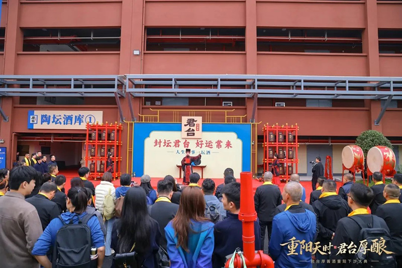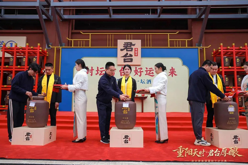 随着锣鸣铿锵落定,坛坛美酒就此封藏,入陶坛静待岁月醇化。这不仅是对美酒的珍藏,更是与时光的盟约,诠释着君台“厚藏”工艺的深远意境。